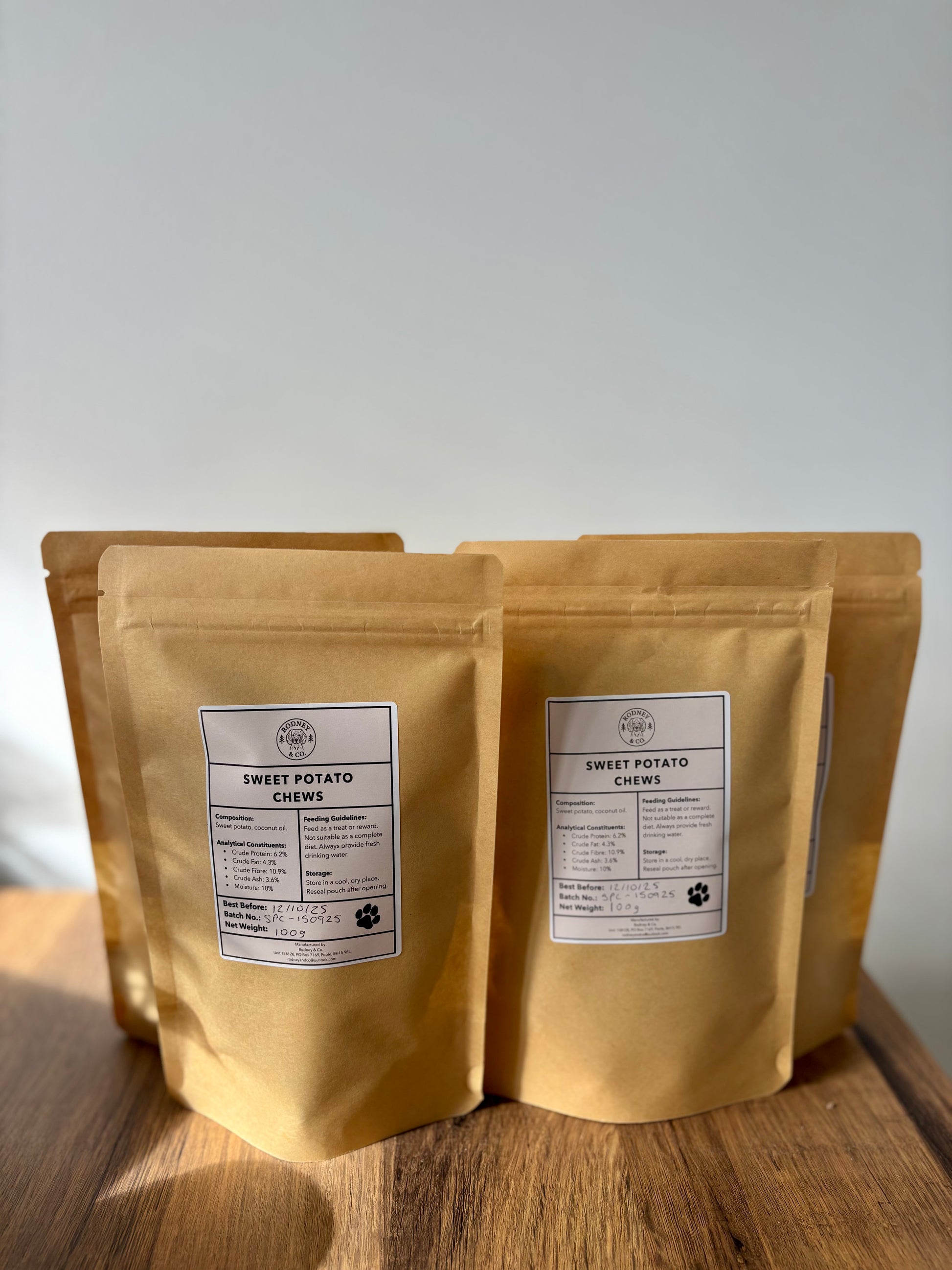 At Rodney & Co. we believe the best treats don’t need a long list of ingredients. Our Sweet Potato Chews are made in small batches from just two simple ingredients: fresh sweet potato and a touch of coconut oil - nothing artificial, nothing unnecessary.